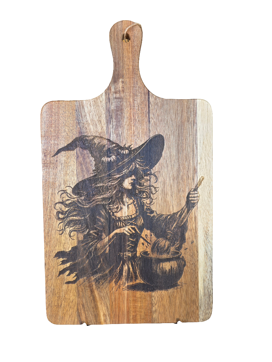 Bring a touch of magic to your kitchen with this handmade acacia wood cutting board, featuring a beautifully detailed laser-engraved witch stirring her cauldron.